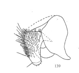 形态 ♂:体长8.0mm。眼密生长纤毛;额狭,稍大于前单眼宽,间额黑,狭如线;下眶鬃仅下半部发达,上半部细毛状,无上眶鬃;侧颜向下去渐宽,上方最狭处至少等于触角第三节宽;触角黑,第三节长约为第二节的2倍长;芒长羽状,最长芒毛至少为触角第三节宽的1.5倍;中颜...