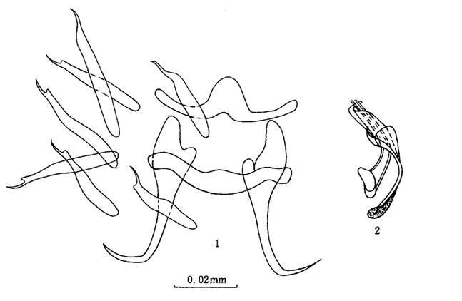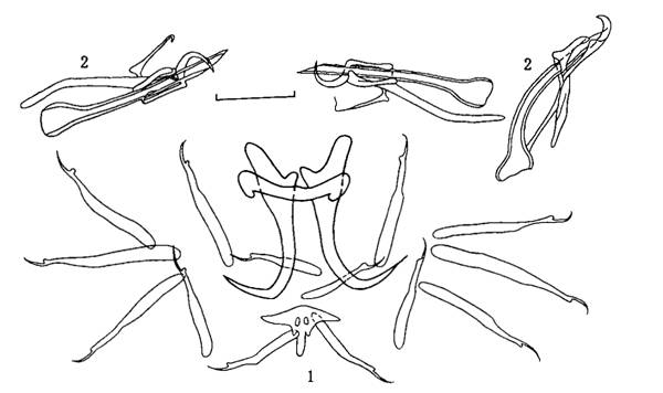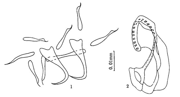 0.027—0.028mm。后吸器与体分界明显,大小0.067—0.095×0.121—0.124mm,具2联结片。边缘小钩指状,柄轴分化不明显,长0.030—0....