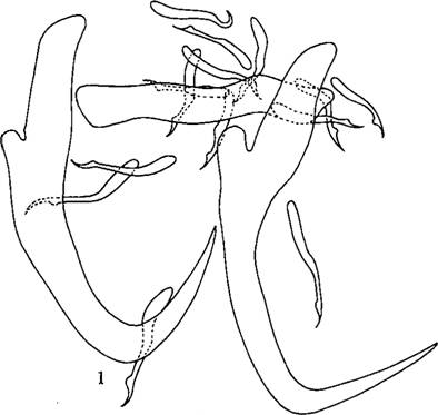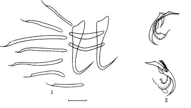 体小型,长0.319-0.420mm,宽0.051-0.060mm。中央大钩内、外分界不明显。边缘小钩长0.020---0.040mm0中央大钩全长0.029--0.032mm,基部长0.026---0.028mm,钩尖长0.011—0.O l ...