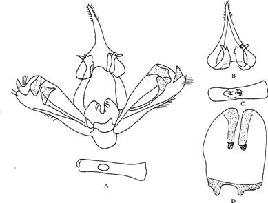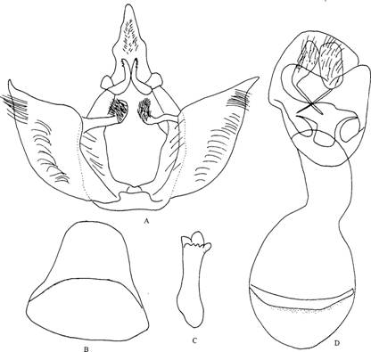 形态 雄蛾触角干橙黄色,栉齿浅黄褐黄色;下唇须浅橙黄色,外侧上方琥珀黄色;头部和胸部浅橙黄色;腹部粉黄色,每节后缘具暗褐黑色环带;肛毛簇火黄色;胸部下面粉黄色;腹部下面暗褐黑色;足白粉黄色,被有琥...