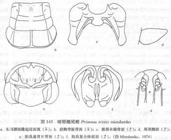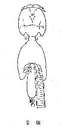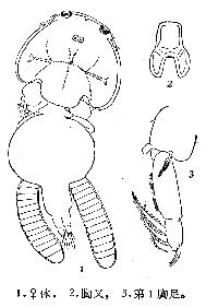 部,有两个大的后侧叶,后侧叶的长度约为节本身长度的2/3—3/4。腹部长,长度约为宽度的三倍。尾叉短,近乎方形。