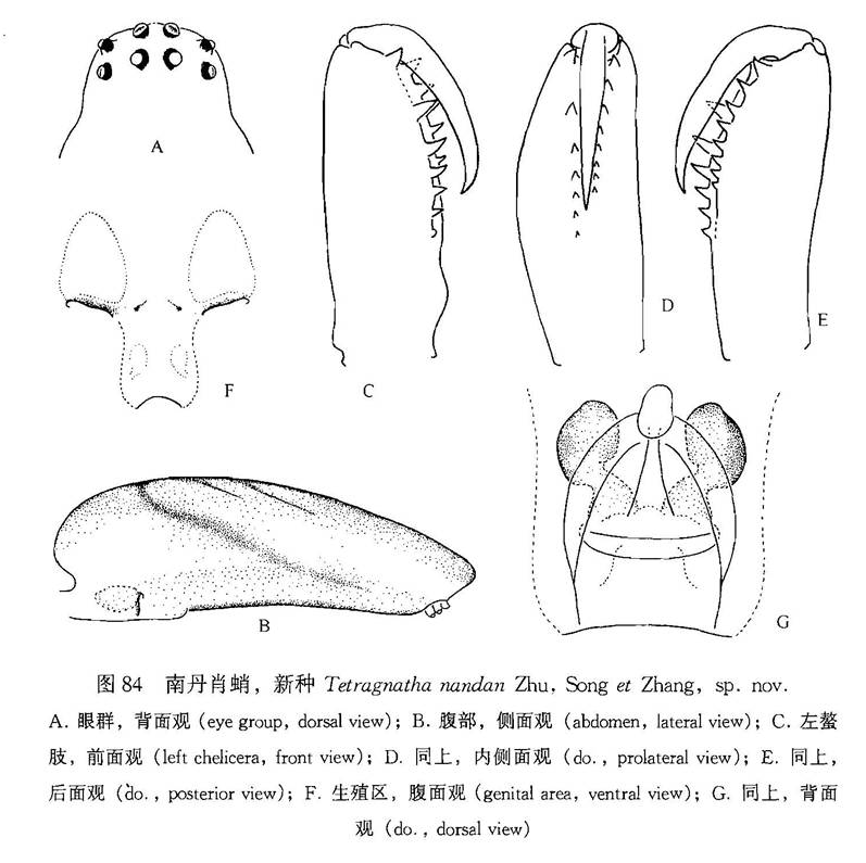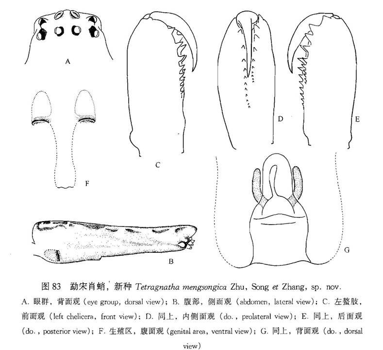 雌蛛体长11.79:头胸部长3.33,宽2.07;腹部长8.73,宽2.16。螯肢长1.88。背