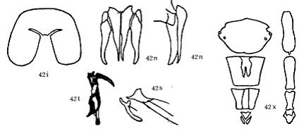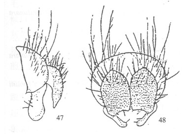 ♂:眼有疏短微毛,几乎裸,额宽为前单眼的1.2—1.7倍,又为头宽的0.04倍强, 仅内顶鬃发达,侧后顶鬃通常为2个或2个以上,少数一侧仅1个,无上眶鬃,下眶鬃11—14(其中7—9个较大,间有细毛,最后的4—5个如毛状,列外侧有小毛2—3行, 向下去连到...