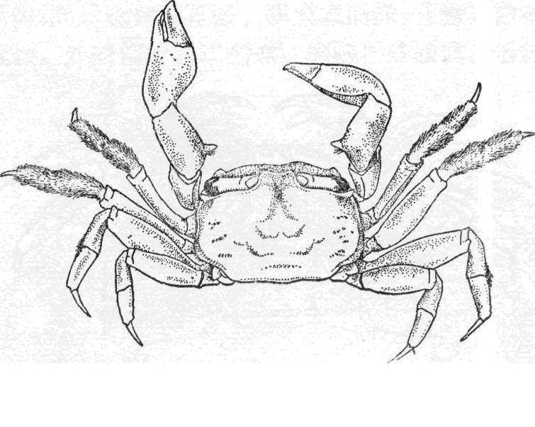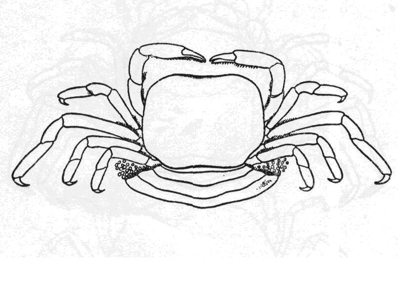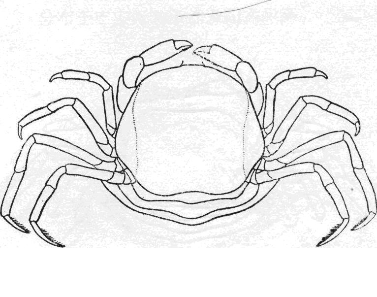 头胸甲的寬度大于长度,呈四方形,表面光滑,有光泽,前侧綠甚拱,侧緣近平行,前、后緣均内凹。額向下甚弯曲,因此由背面看不見額郃,前緣分3齿,侧齿較中齿为突出。第三顎足座一长节的内角鈍圆,最末两节状如前广种的。螯足光滑,长节内緣具短毛,腕节长,内緣基部具短毛,掌节...