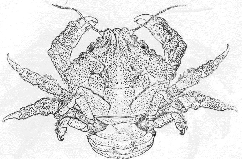 头胸甲表面隆起,寬稍大于长,除螯足和步足的指节外,全身密布顆粒及稀疏刚毛,分区可辨。額分3齿,两侧齿鈍,中齿較低且个。眼窝小,眼窝的腹齿呈錐形,从背面可以看見。前侧緣具3鈍齿,末齿最小。肝区的齿状突起位于第一侧齿的内方,肝下区与頰区之間的縫綫上又具一齿,卽在第...