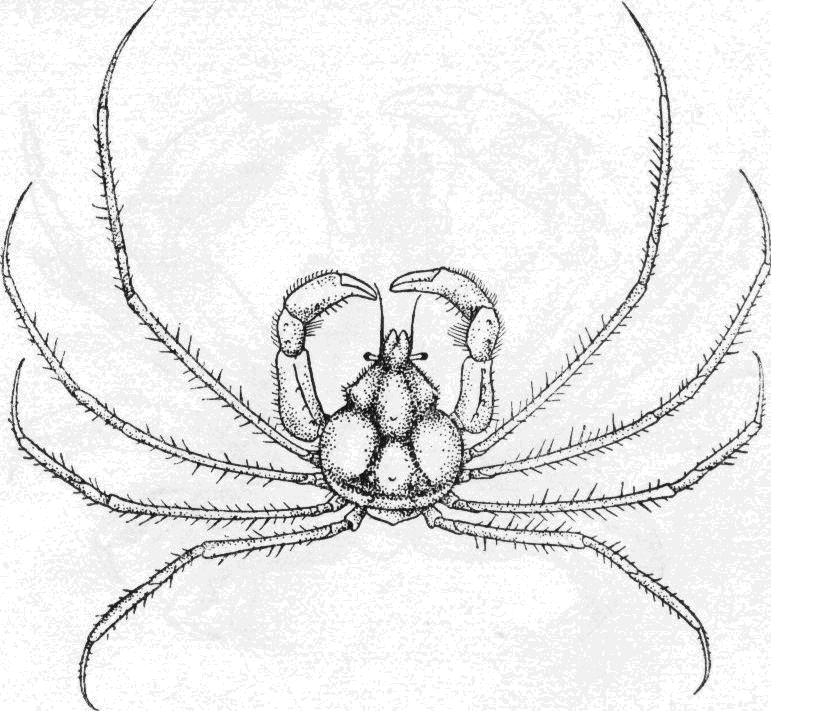 头胸甲較一般种类为窄,表面不平滑,具少数顆粒,尤以蹤区較显著,多数顆粒带短刚毛。額緣略凹,背面具寬沟。眼窝背緣略拱,外角指向前側方,在外角之后具一缺刻,呈三角形。眼窝腹綠的外端具一三角形齿状突出。前側缘前半段几乎平行,后半段略向后方傾斜。螯足长大,腕节特別长,...