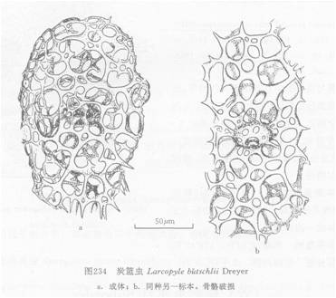 相对的极针,针为三片棱柱形,末端削尖,基部较宽(宽度约占皮壳孔2至3孔)。皮壳孔类圆形,纵轴有12-14孔,横轴有10-12孔。髓壳呈梨形(183b),壳壁较薄,具规则排列的六角形网孔,纵轴占7-8孔,横轴占5-6孔,壳壁上...