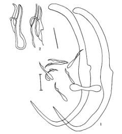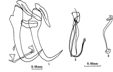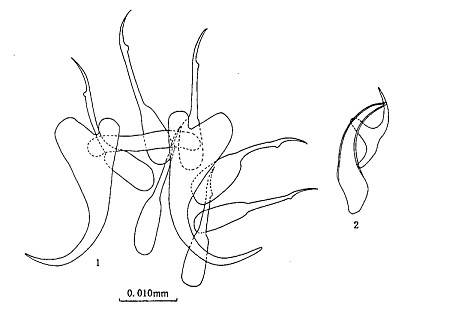 后吸器仅具一联结片。边缘小钩具发达的柄,柄轴,钩尖基突,其长0.14—0.24mm。中央大钩全长0.092-0.lOO...