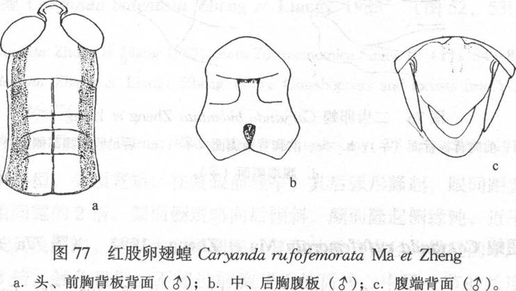 雄性 体小到中型。头短,短于前胸背板。头顶顶圆形,在复眼前的宽度为长的1.5倍,眼间距宽与触角间颜面隆起等宽。后头光滑,不具中隆线。颜面倾斜,颜面隆起全长具纵沟,直到达唇基。触角丝状,细长,超过后足