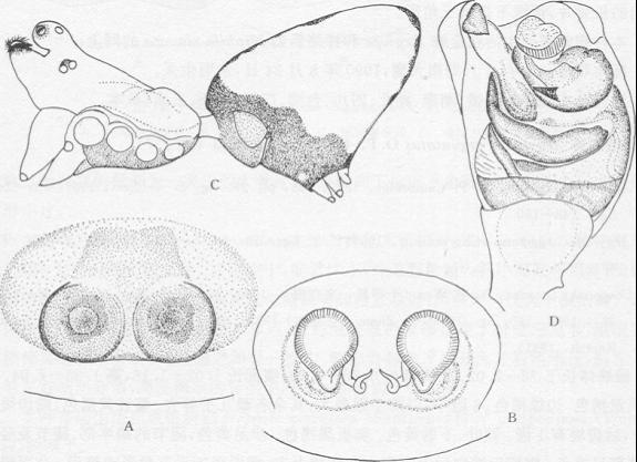 雌蛛体长2.15—2.57。头胸部长1.16—1.22;腹部长1.32—1.55,高1.95—2.24。背