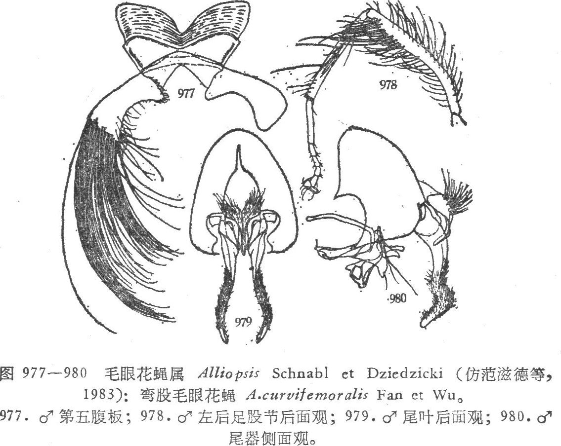 形态特征 ♂体长5—7毫米。眼有疏微毛,外顶鬃不发达,额宽略狭于后单眼外缘间距,间额为一侧额的3倍半宽,间额鬃一对,长;无上眶鬃,下眶鬃9—10;头前面粉被灰色,侧颜微宽于触角第三节宽,颊高约为侧颜宽的一倍半,上倾口缘鬃4—5行,后头背区有毛;触角第...