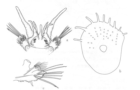 无针。关节足4条,略呈辐散形而内带小室,其长约为壳之半径或稍短,末端笔直向下