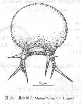 壳呈球形,壳壁中等厚度,表面略粗糙,壳孔呈不规则多角形或椭圆形,大小不一,排列不规则,横跨赤道占10-12孔。具20-40