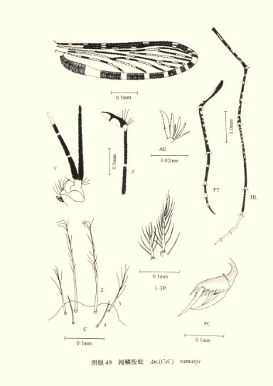 鉴别特征 黄棕色蚊虫;中胸盾片有4或更多个圆