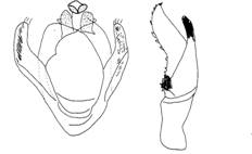 很相似,但有以下不同:前翅正面中点向前缘渐窄,底部较膨