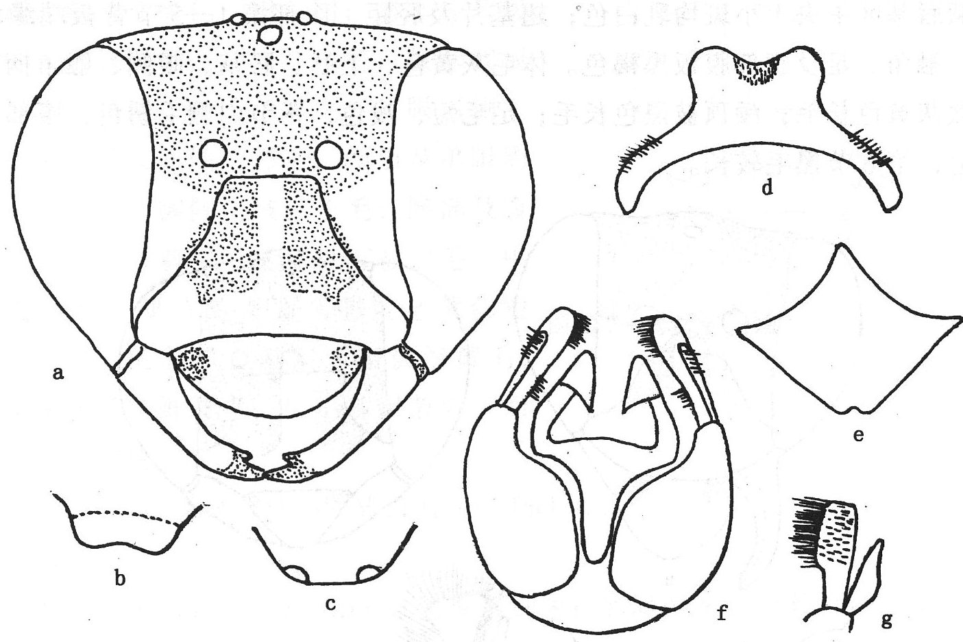 褐色。唇基端半部及颜面刻点大而均匀,唇基基部及额的刻点较细密;两侧单眼外侧平滑几无刻点;颅顶中央刻点似唇基端...