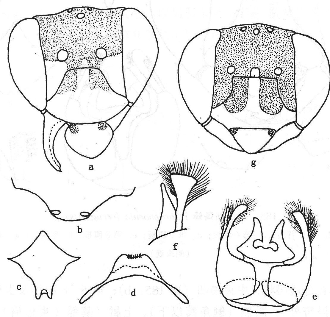 雄体长12mm;体黑色,被灰白色毛;腹部第2—6节端缘具白色毛带。头部(图114:a)的上唇及颜侧(触角窝以下)光滑,具稀的大刻点;上唇基部两侧各具1圆斑;上颚2齿;唇基刻点较上唇密,基部黑斑上刻点密;触角第1鞭节稍短于节2+3;胸部盾片刻点密集,中央光滑闪光...
