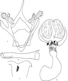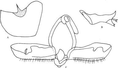 体长20 mm,翅展48 mm。头、颈板和翅基片暗灰褐色,中胸带赭红色,后胸暗灰褐色具黑色横线。跗节黑褐色具白环。腹部背面赭黄色,从基部到末端逐渐变浅,末端灰褐色;腹面赭灰色。前翅灰褐色,基部较暗近黑色,亚端区色较浅;从基部下方到后缘齿形毛簇有1斜的浅黄色斑,...