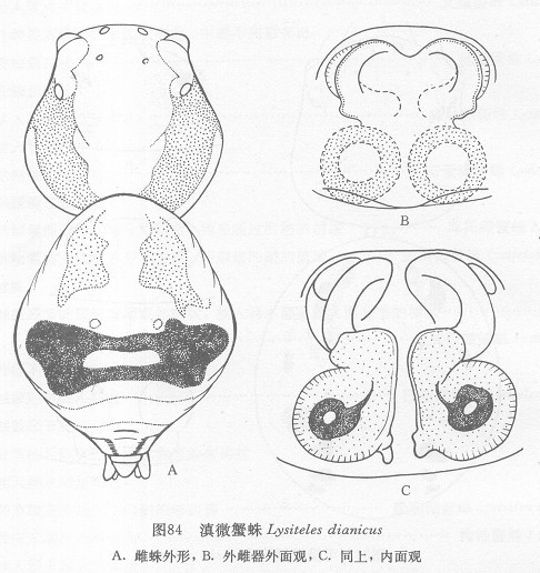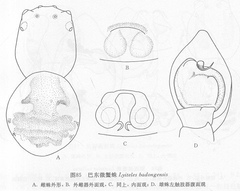 雌蛛体长2.84毫米。头胸部长1.35,宽1.20;腹部长1.71,宽1.45。头胸部褐色。两眼列后凹。前侧眼最大,后侧眼次之,后中眼最小。中眼域后边大于前边(0.38:0.32),长宽相等(0.32)。额高大于两前中眼间距(0.23:0.16)。螯肢短粗。左...