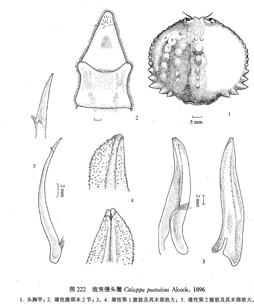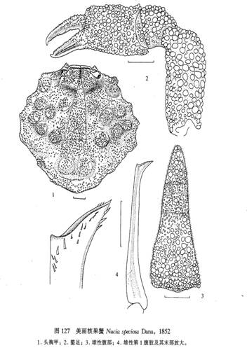 形态描述 头胸甲近圆形,宽稍大于长,背部甚隆,具7纵列疣状突起,近侧缘的一条最不明显。额突出,分为两钝齿。前侧缘长,呈弧形,前半部有细齿,后半部的齿较大,呈三角形,盾状部发育不良,前2/3处有5枚爪状齿,后1/3向后收敛,无齿,后缘有3枚钝齿叶,中叶宽于侧叶...