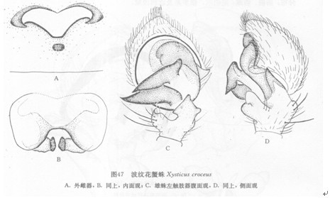 雌蛛长5.50—10.00毫米。头胸部长2.59—3.85,宽2.59—3.55;腹部长2.80—6.44,宽2.90—6.30。背甲中央色泽较淡,两侧各有一深棕色宽带。颈沟及放射沟不明显。8眼二列,均后凹,前眼列短于后眼列。前、后侧眼均具眼丘,但互相不愈合。...