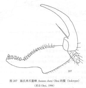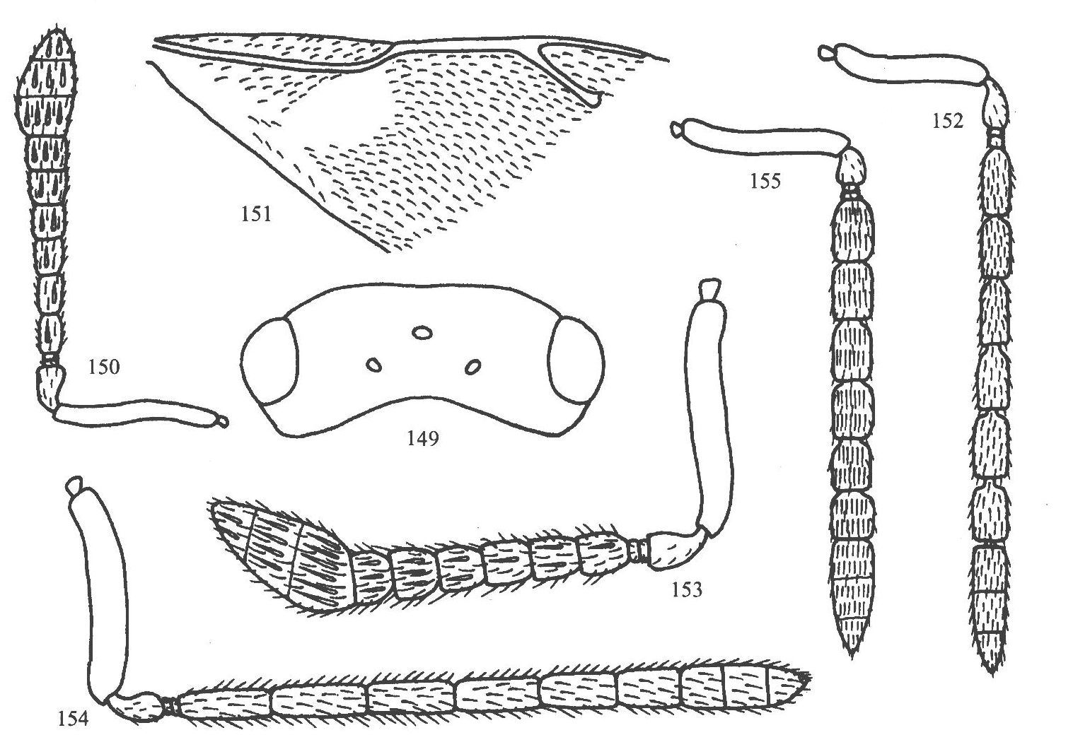 雄:体长2mm。体蓝黑色。触角柄节、梗节和环节棕色;索节和棒节褐色,腹面褐黄色。足基节蓝黑色,基部4跗节褐黄色,其余足节棕色。翅透明,翅脉褐黄色。