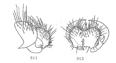 雄性 头顶三角黑色,单眼三角前覆白色粉被;额前伸超出口缘,黑褐色,两侧密覆银白色粉被;颜上半部黑色,下半部黄色,覆银白色粉被;颊前半部红褐色,后半部黑色;后头黑色,覆白粉被和黄毛,中下部毛长。触角基部2节黑褐色,第3节红褐色,覆黄灰色粉被,宽大,椭圆形;芒