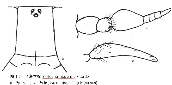 形态 ♂:体长7.3—7.8mm。眼密生长纤毛;额稍狭于前单眼三角宽;间额狭,为一侧额宽的1/2;侧额、侧颜具银灰粉被;下眶鬃几达单眼三角处,仅前半部的4—5对发达,无上眶鬃;侧颜狭,为触角第三节宽的1/2;触角黑,第三节长于第二节长的2倍,为本身宽的2.7...