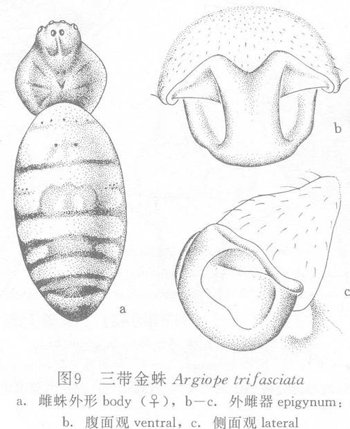 胸部长4.00,宽3.60;腹部长9。00,宽4.50。背甲黄褐色,被银白色毛,颈沟、放射沟明显,放射沟处灰黑色。中窝横向,胸甲黑褐色,正中银白条斑,有二侧支,短而圆。螯肢黄褐色,前缘灰黑色,前齿堤4齿,近基...