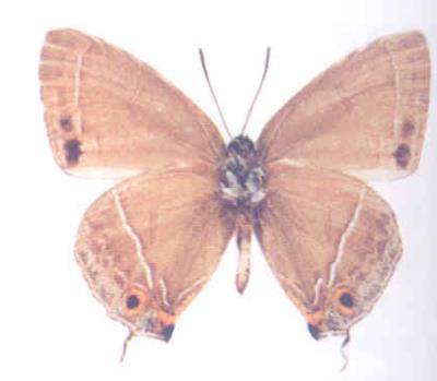 雄蝶青绿色具光泽,前翅外缘黑带窄细;后翅外缘黑带较宽,前、后缘灰黑色带更宽,后角附近具细长尾突。反面灰褐色,前翅白色外线颇细,阴影不显;后翅的外缘线较显著,后角纹2个,其中角后不完整橙色环沿后缘延伸。雌蝶翅色青紫色扩散至中室外侧,不具橙色斑,后翅黑褐色,前后缘淡色。