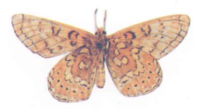 本种前翅窄长,前后缘平直。翅面橙黄色,脉纹褐色。前翅端半部有3条黑色横线;后翅外缘淡黑色,亚外缘横线宽,内有黑点列,翅基部有1双黑色环斑。前翅反面亚外缘横线波曲,中横线上段细,下段淡褐斑;后翅反面外缘斑三角形,内有黑色细横线,亚外缘为宽的横带,内有黑点列;中横...