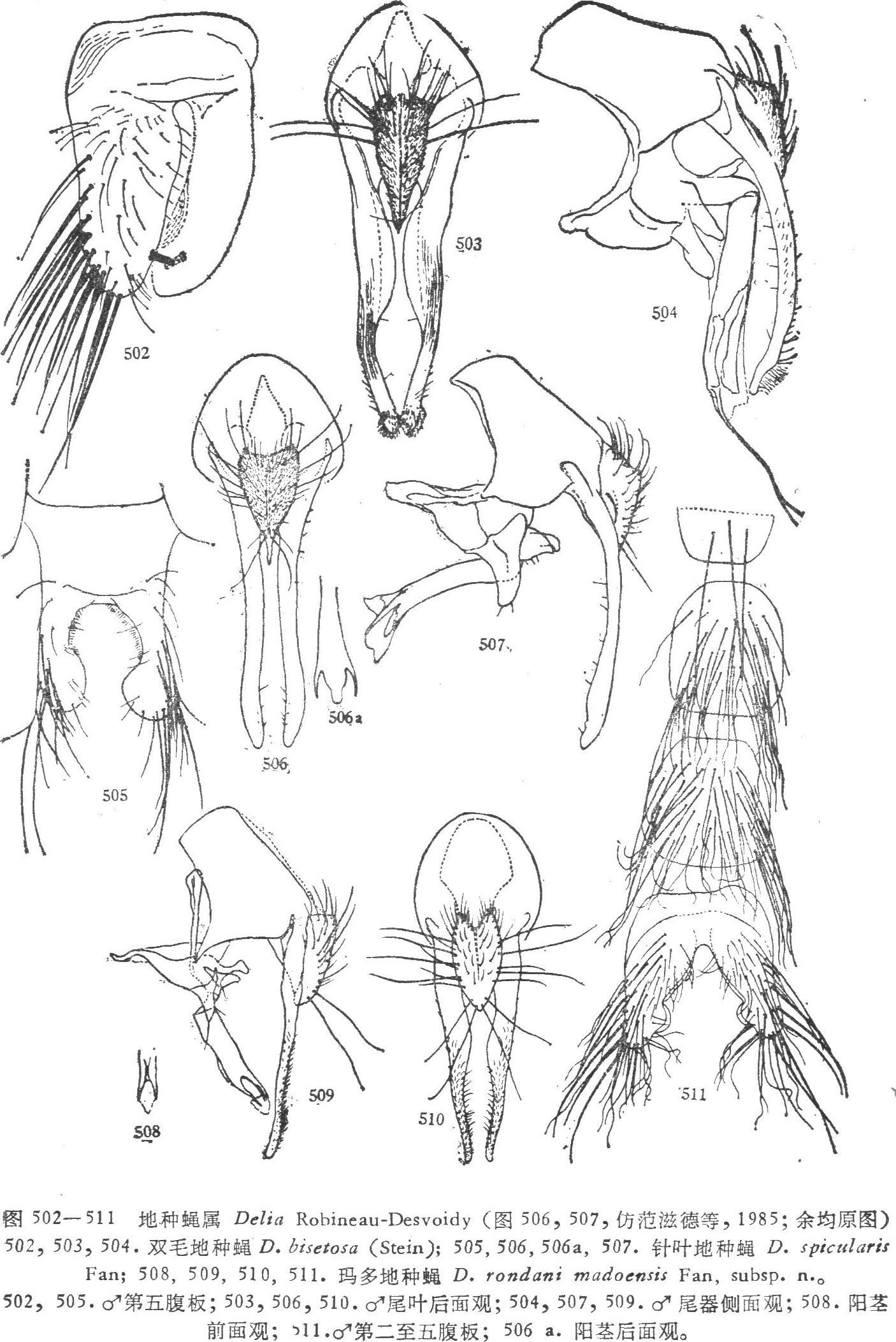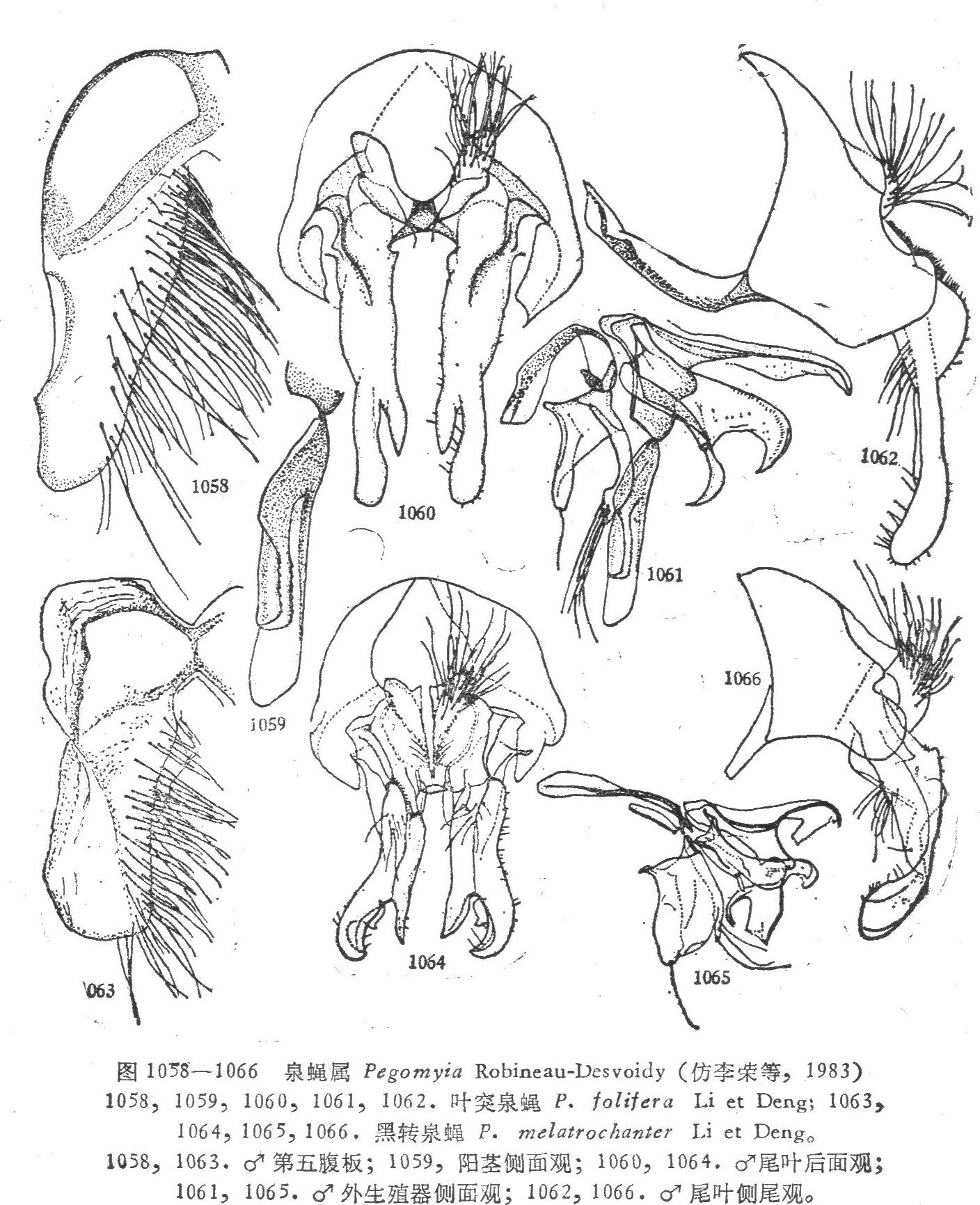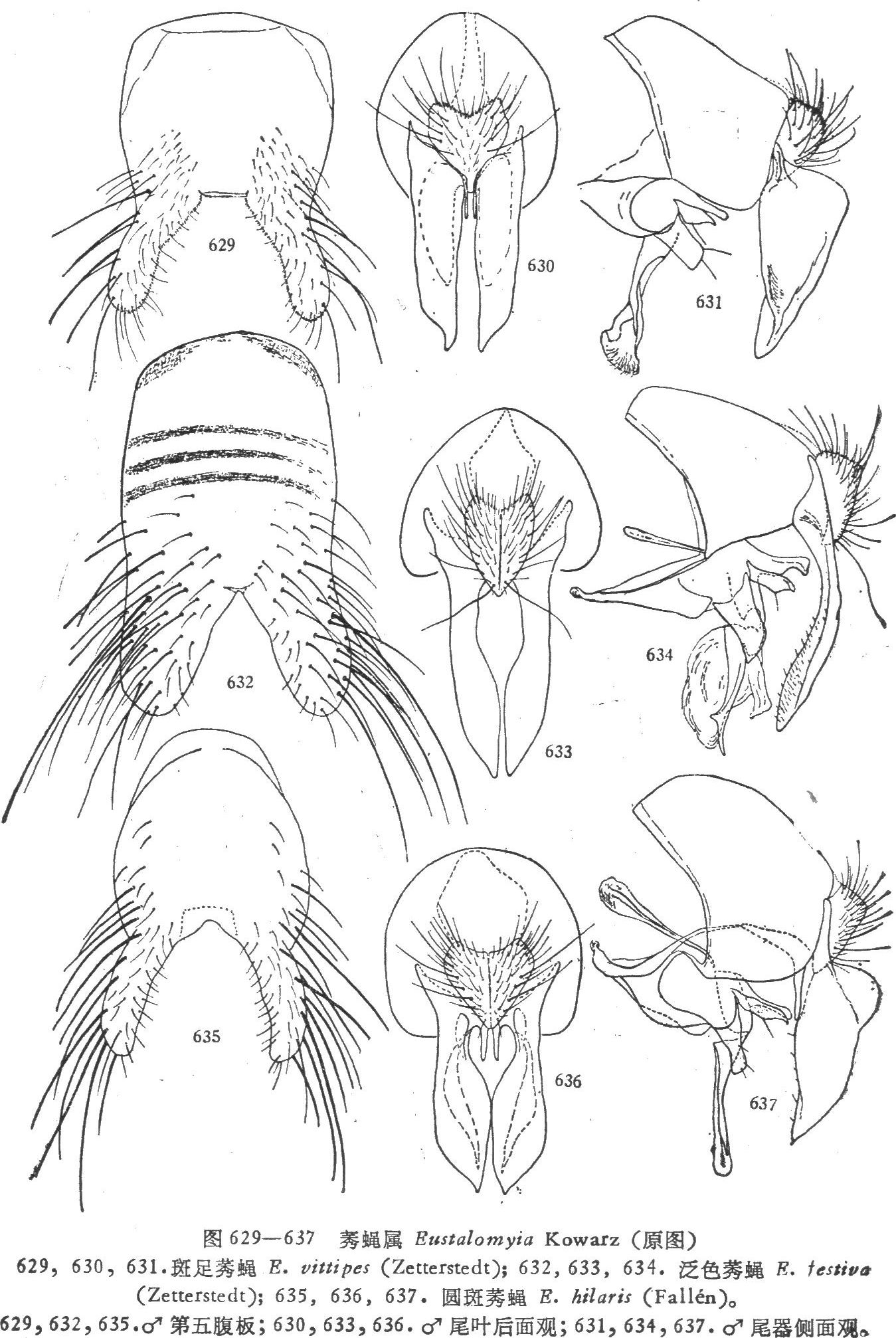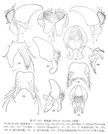 形态特征 ♂ 体长9.5毫米。♂触角芒长羽状;无上眶鬃,下眶鬃8个,胸背有一明显的暗色正中条,在其后端往往扩大成圆斑,但有时不扩大成圆斑,前中鬃3,肩唇鬃1:(1—2),翅前鬃比前背侧片鬃稍短,腹侧片鬃1:3,小盾片背面中央无毛;足黑色,前胫端部有一...