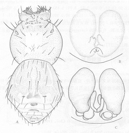 雌蛛长5.79—7.17毫米。头胸部长2.86,宽2.62;腹部长3.33,宽2.94。额部垂直而向前方平伸。额缘略后凹,在前缘稍后处有...