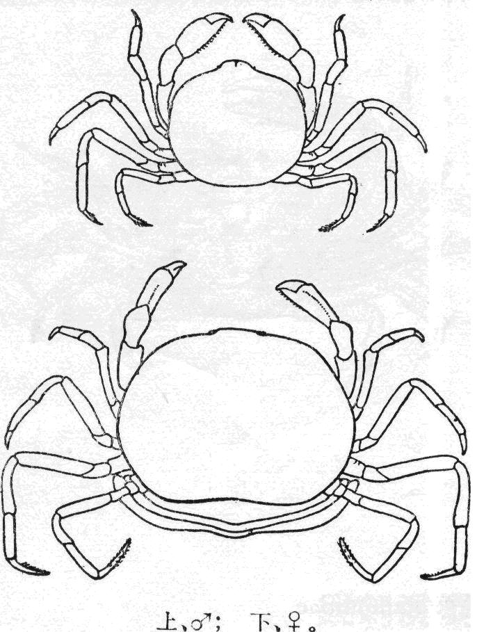 雌性:头胸甲近圆形,宽度大于长度,表面光滑,稍隆起,前、后侧角弧形,侧拱起,后緣中部凹入。额窄,向下弯曲。眼窝小而呈圆形,眼柄甚短。第三颚足的指节短小,呈窄条状,不超越前节的末端。螯足光滑,长节圆柱形,腕节长大于宽,掌节末部寬于基部,且蛟指长,可动指内緣基部1...