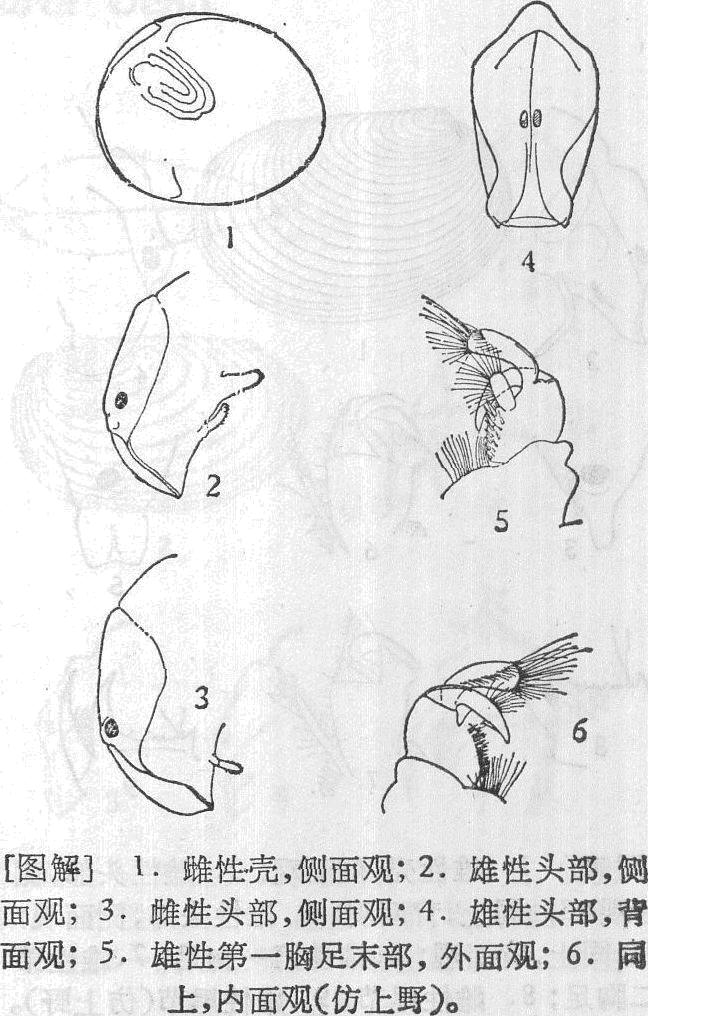 壳的侧面呈圆形,前端较后端略宽。壳腺大而清晰。头部大,顶部具眼一对,有隆线相隔。额角从背面观钝圆而突出,自侧面观弯向后下方。雄性第1—2胸足为执握肢,末节均呈钩状爪,掌节的末缘伸出一指状突起,长而弯曲,末部较基部为粗壮,内、外侧及末端均具长刚毛。第一胸足掌节腹...
