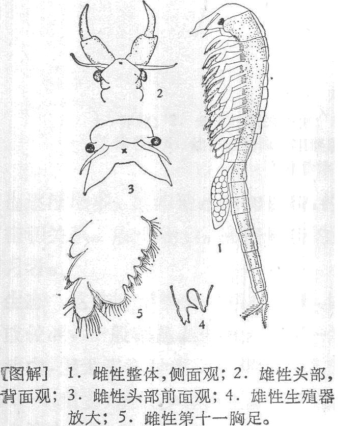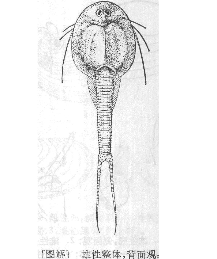体形很长,尤以裸出的后体部为甚。雄性背壳较小而呈圆形,背面亦较扁平,中央的纵行隆线较短。背壳前缘呈圆弧形,两侧缘凸出。后缘内凹。后体部未被背壳掩盖的部分约当背壳长度的一倍半。无肢体的后体部(包括尾节)分13—14节(也有个体分15节者)。尾叉较背壳稍长,其腹面...