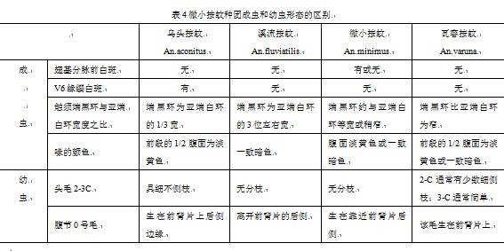 鉴别特征成幼虫都与溪流按蚊非常近似,雌蚊盾片中部无鳞片或仅有毛状鳞;喙一致暗色或在端腹面有一淡色斑;触须具3个