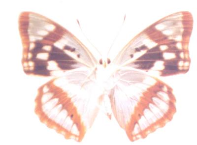 斑围绕。翅反面前翅同正面,后翅稍显黄色,基部有1个橙黄斑,亚缘各室箭头纹伸达外缘。