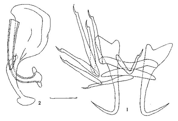 体长0.21—0.35mm,宽0.09mm。后吸器具2联结片。边缘小钩长0.019—0.029mm,第3对最长,第7对最短。中央大钩呈D.wunderi型,全长0.054—0.059mm,基部长0.040—0.044mm,钩尖长0.019—0.0...