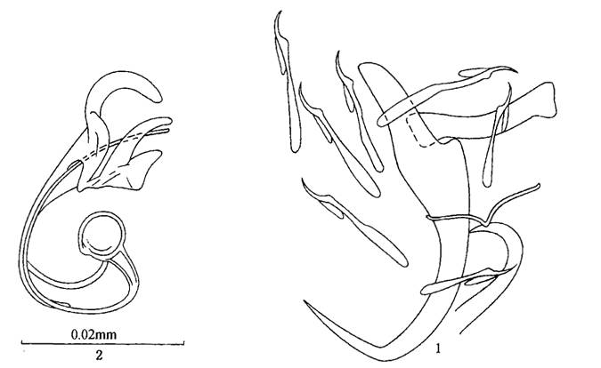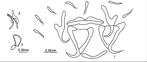 体分界不很明显,大小0.11 6—0.1 66×0.11 6—0.1 83 mm边缘小钩...