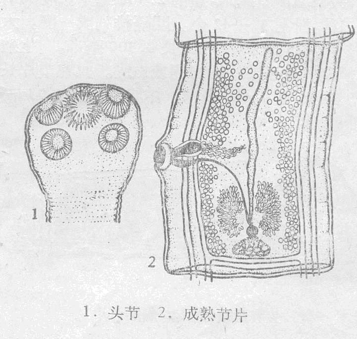 新鲜时白色或淡黄色。全长60-150厘米,宽度0.768-3.500毫米,计有267-400个节片,成熟节片长度大于宽度,长2.3-3.75毫米,宽1.75-2.35毫米。怀卵节片长10-12毫米,宽4-6毫米,生殖孔不规则的位于节片的左侧或右侧。头绪细小...