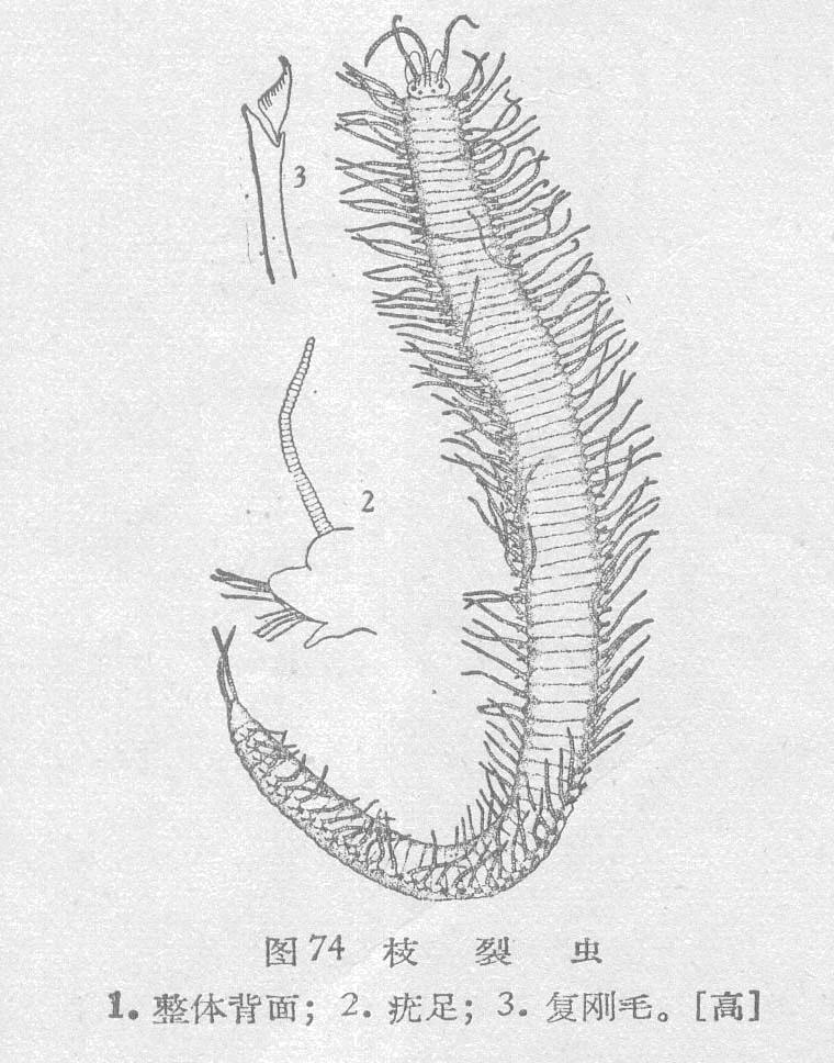 体細小,长20-30毫米,寬不超过1毫米,約100余个体节。头部明显,略呈椭圆形,横寬,有三个細长的触手由背面伸向前方。眼有两对,前面的一对較大,距离很远,后面的一对較小,距离很近。口前叶腹面有一对粗大的触肢,伸向前方。围口节甚小,大部被口前叶所掩盖,亦有触須...