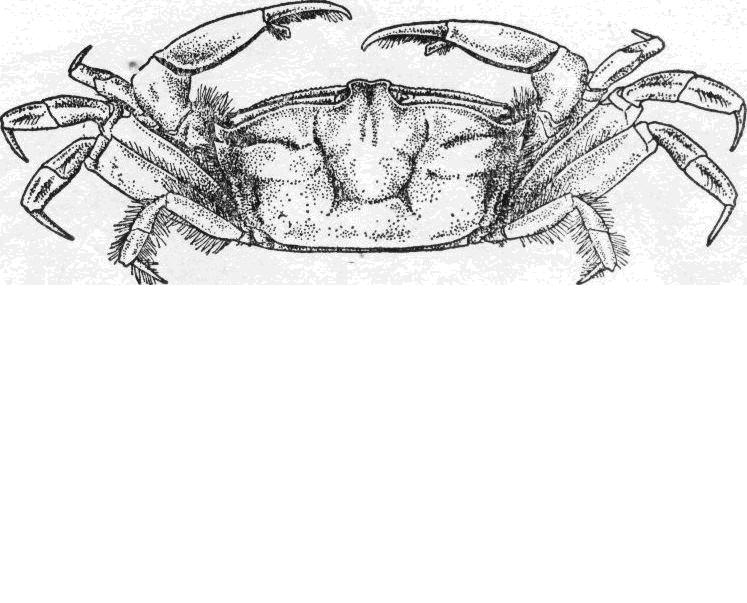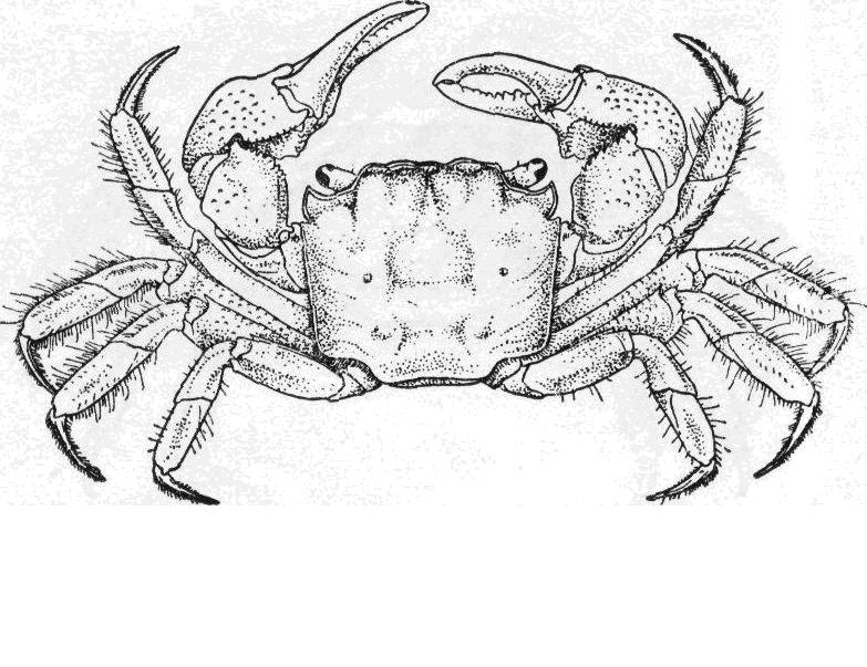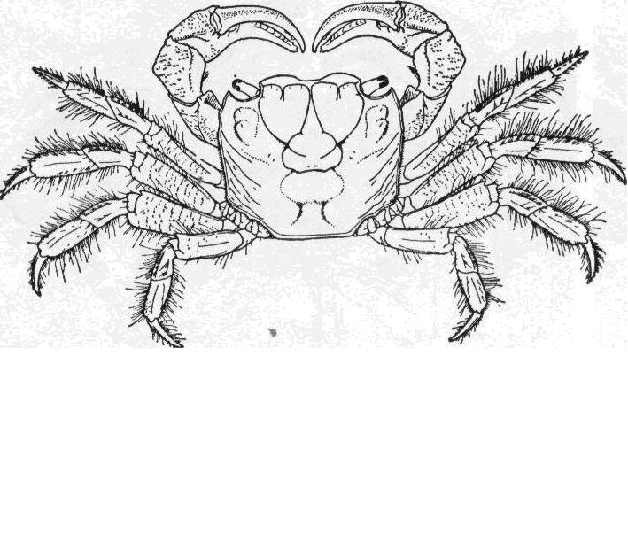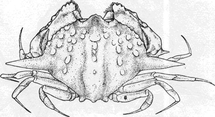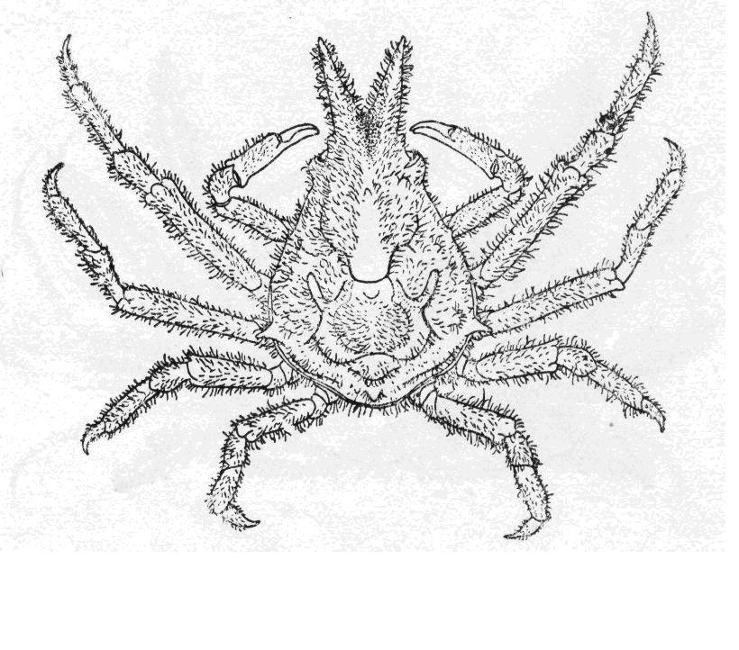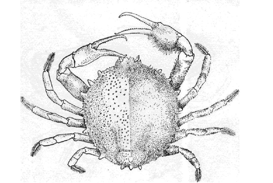 全身密具絨毛,并间有两种刚毛,一种較粗而軟,色較浅,呈棍棒状,常分布于头胸甲的后半部、腹部及步足,另一种較細且硬,色較深,頂端尖銳并弯曲,多分布于头胸甲的前部、额部及步足的背面。头胸甲背面的分区可辨,肝区具一小突起,前胃区具一个,后胃区2个,前面的一个較尖,腸...