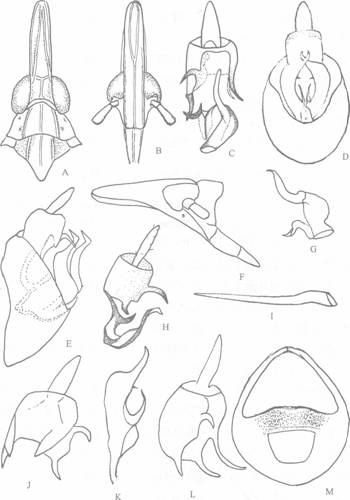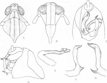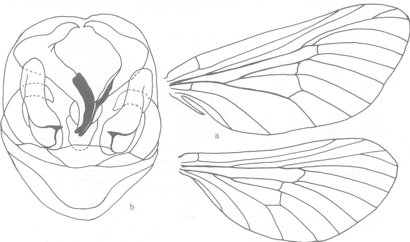 黄色或橘红色。前翅淡黄色,透明,脉与翅面同色。臀突暗褐或黑褐色。雄虫阳基侧突基、端部的刺突黑褐色;雌虫产卵器深褐色。