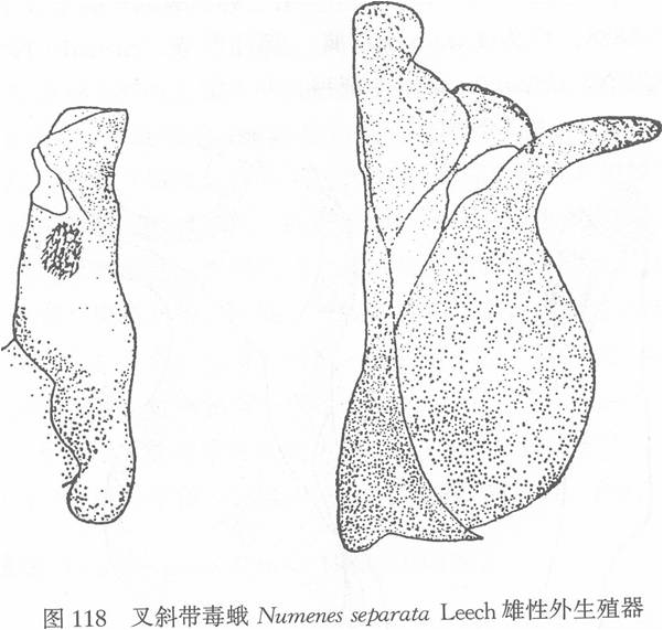 形态 雄蛾与白斜带毒峨N.以lbofascia(Leech)相似,但本种前翅具黄白色“Y”形带,通向翅顶的带较纤细,从前缘到臀角的带较宽,两带在M2脉与M3脉间汇合;在翅基部前缘有一黄白色小点;...