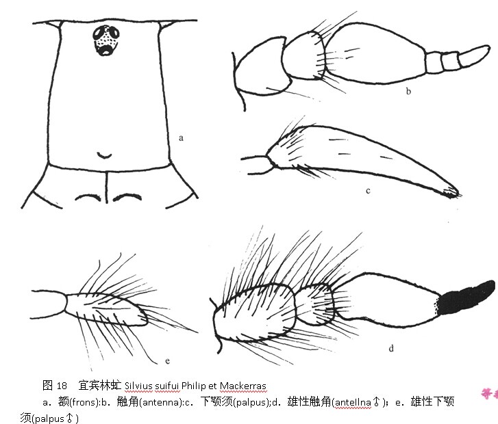 ;头项具3个棕黑色单眼,单眼瘤区亚亮,两侧与复眼接触,着生棕色毛和黑毛;额高为基部宽度的1.1倍,顶宽于基宽,灰黄色,着生稀疏的灰白色毛;额基胛黑色,两侧与复眼分离;亚胛灰黄色;颜与...