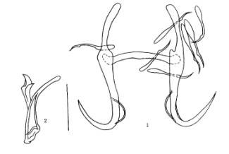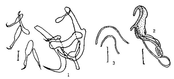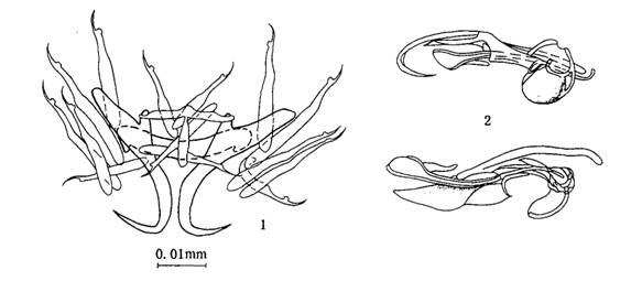 后吸器具二联结片。边缘小钩具明显区分的柄、柄轴及钩尖基突,其长0.018—0.038mm,第3对钩最长,第6对钩较小、中央大钩似D.wunderi。全长0.0...