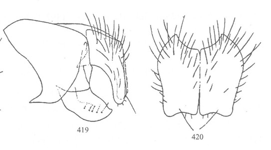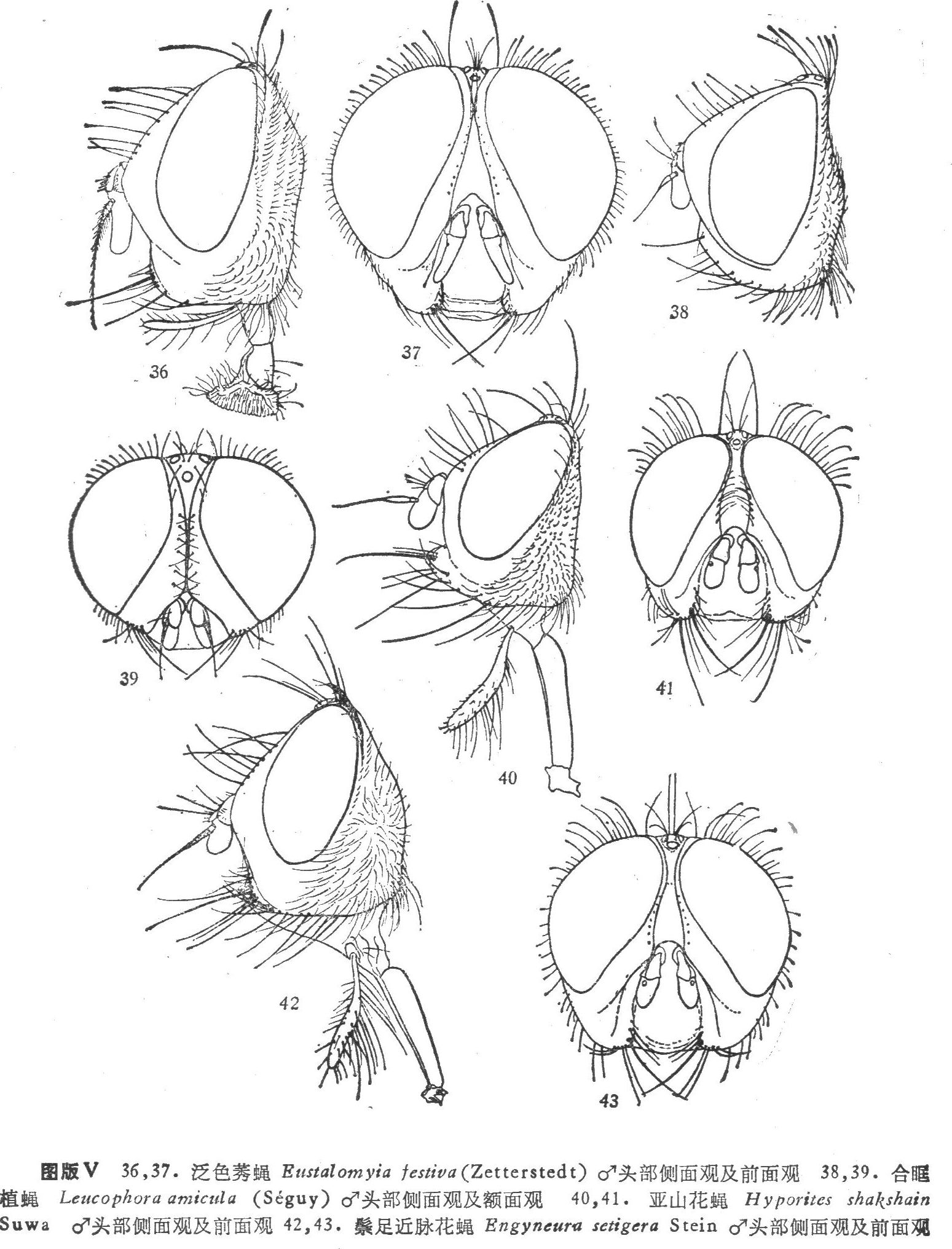 形态特征 ♂ 体长4—5毫米。眼有短微毛。额稍宽于前单眼,约为1.5倍;侧额几乎相接,无上眶鬃,下眶鬃7对,杂有小毛,间额鬃2对;头前面粉被银白,侧颜与触角第三节等宽,上倾口缘鬃2行,口前缘略略前突,约在额前缘一线上。触角芒具短毳毛。中喙有粉被,前...