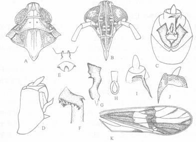 头胸部黄褐色,但额、颊、唇基污黄褐或暗褐色,额和颊有一些浅色小圆斑,中胸背板中域黄色,侧脊外方污黄褐至暗褐色。前翅革片基半部有一