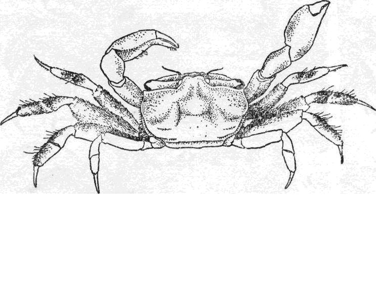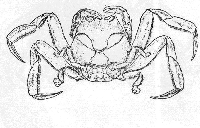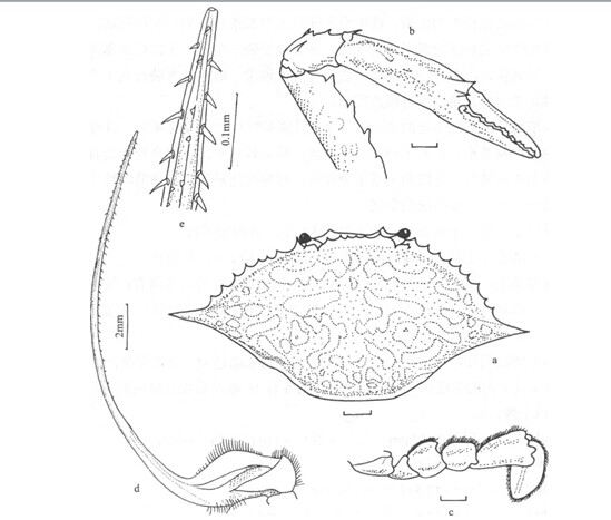 头胸甲背面除鰛区及額区具顆粒外,均光滑。各区以沟为界,沟中有歎毛,后額区及肝区亦具軟毛。额緣寬,稍内凹,由背面多少可見内口沟的隆脊。眼窝腹緣的内齿长,呈刺形,超越額齿。雄螯近于等大,各节背緣具短毛,掌节背綠的短毛延伸至可动指基部,长节腹緣亦具短毛。前两对步足长...